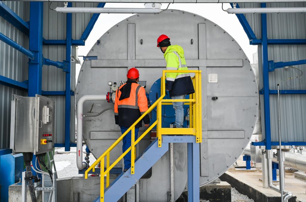 2月12日,中國(guó)工作人員在土耳其阿克薩拉伊省的圖茲湖地下天然氣儲(chǔ)庫(kù)擴(kuò)建項(xiàng)目地面場(chǎng)站查看設(shè)備。新華社記者劉磊攝