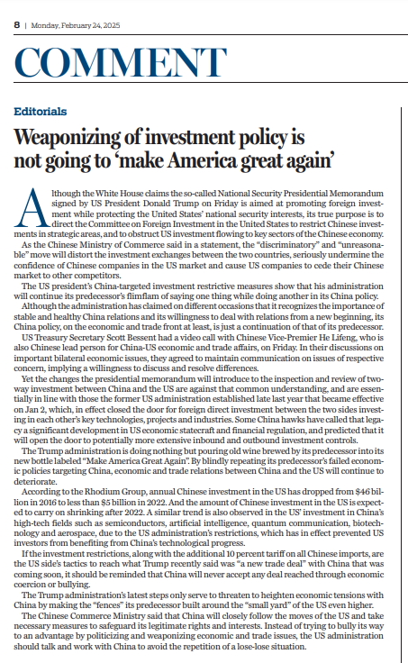 上周五(2月21日),美國總統(tǒng)特朗普簽署所謂的“國家安全總統(tǒng)備忘錄”(下稱“備忘錄”)。白宮稱,該備忘錄旨在鼓勵(lì)外來投資的同時(shí),保護(hù)美國國家安全利益。然而,其真實(shí)目的是責(zé)令美國外國投資委員會(huì)限制中國對美國關(guān)鍵領(lǐng)域投資,并妨礙美國對中國關(guān)鍵領(lǐng)域投資。