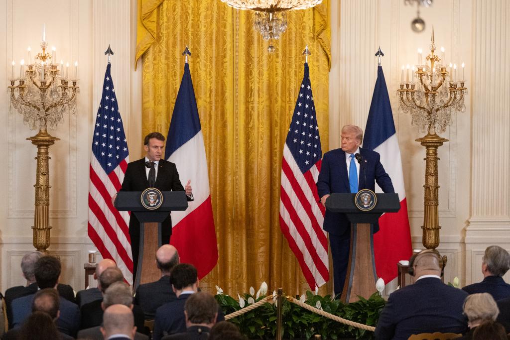 2025年2月24日,美國(guó)總統(tǒng)特朗普(右)在華盛頓白宮與到訪的法國(guó)總統(tǒng)馬克龍舉行會(huì)談后的聯(lián)合記者會(huì)。新華社記者胡友松攝