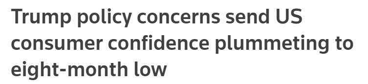 報(bào)道稱,特朗普是因?yàn)橄蛎绹顺兄Z會降低通脹和物價(jià)才當(dāng)選總統(tǒng)的。在他獲勝后,美國企業(yè)和消費(fèi)者信心曾一度飆升。但他在上任后的僅僅一個月內(nèi)就宣布了連串加征關(guān)稅計(jì)劃,從而“導(dǎo)致美國消費(fèi)者信心暴跌至八個月以來的最低點(diǎn)”。