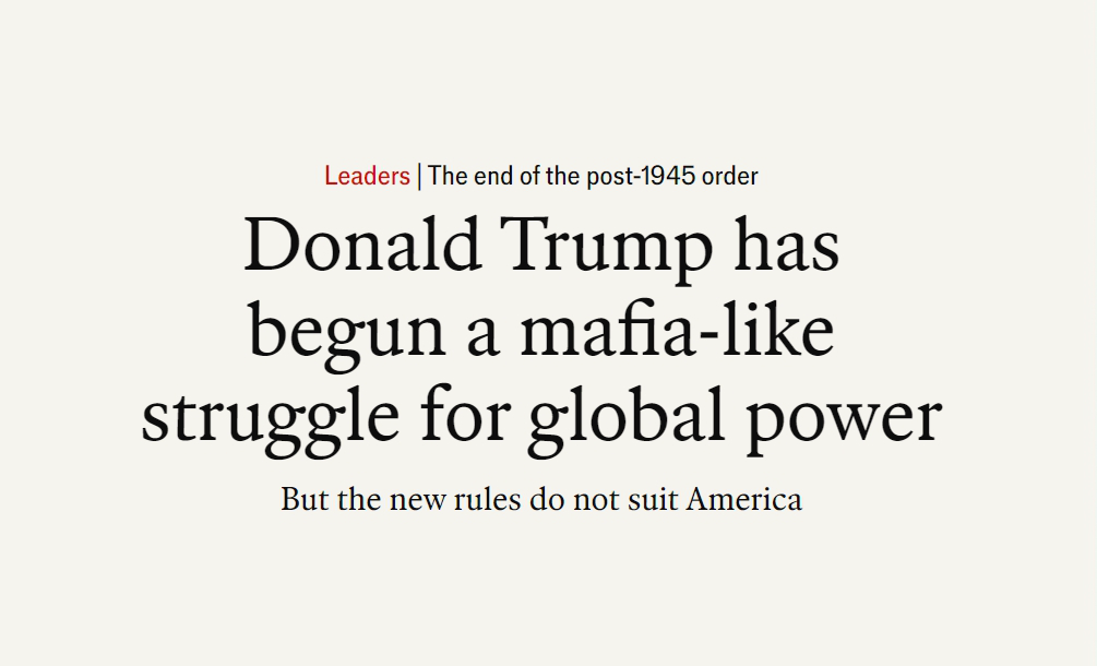 英國(guó)《經(jīng)濟(jì)學(xué)人》網(wǎng)站近期刊文稱,美國(guó)總統(tǒng)特朗普已經(jīng)開啟一場(chǎng)黑手黨式的全球權(quán)力爭(zhēng)奪。1945年后建立的世界秩序正在加速撕裂。一個(gè)強(qiáng)權(quán)即公理、小國(guó)受欺負(fù)的世界正快速到來。文章摘要如下: