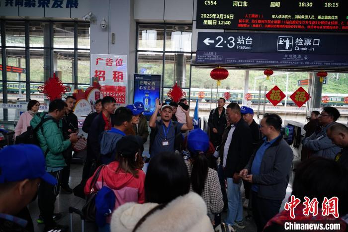 3月16日,云南省紅河州河口縣河口北站,一位導(dǎo)游組織越南旅游團(tuán)候車。中新社記者 劉冉陽 攝