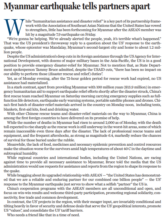 “人道主義援助和救災(zāi)”是美國與東盟伙伴關(guān)系的重要內(nèi)容,美國也信誓旦旦地宣稱要加強(qiáng)救援合作,但截至3月31日下午,緬甸地震72小時(shí)救援黃金時(shí)間已經(jīng)過去,緬甸當(dāng)?shù)厝晕闯霈F(xiàn)美國救援隊(duì)的身影。