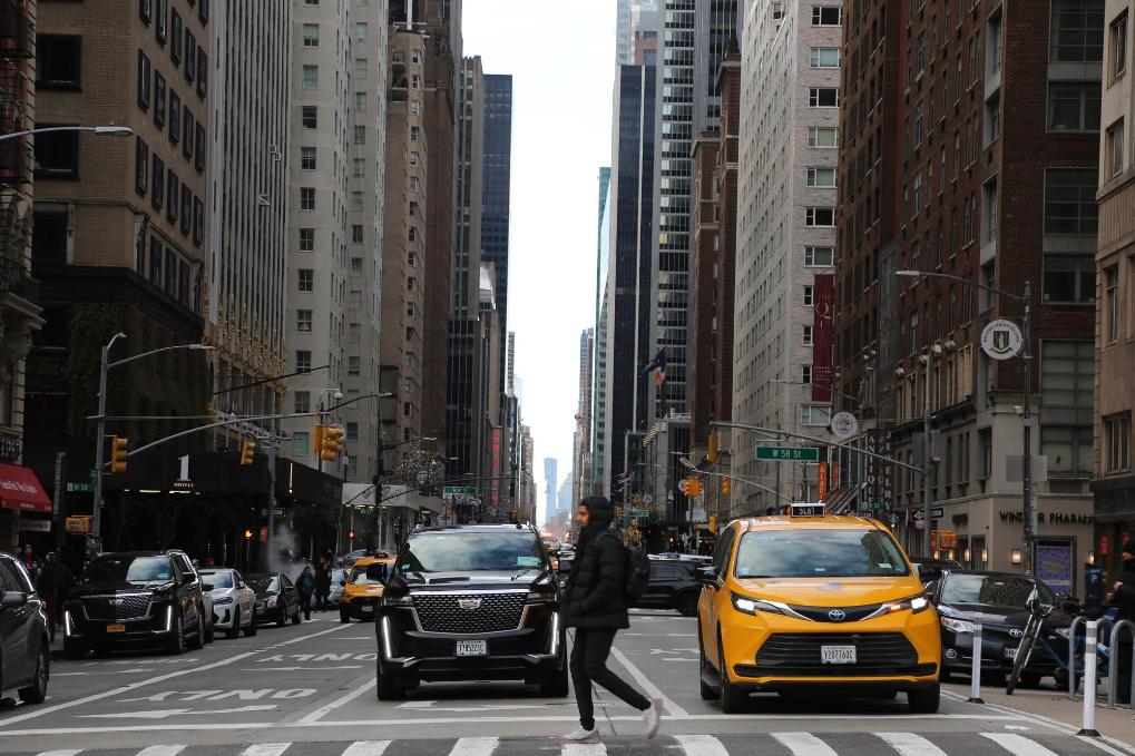 1月5日,在美國紐約曼哈頓,行人通過擁堵減緩區(qū)內(nèi)的一個人行橫道。新華社記者劉亞南攝