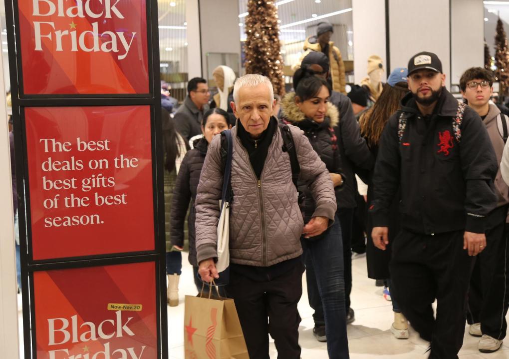 2024年11月29日,在美國紐約曼哈頓島的一家商場內(nèi),人們經(jīng)過“黑色星期五”促銷廣告牌。新華社記者劉亞南攝