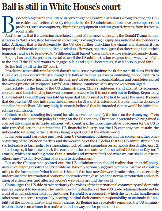 理智之人不難看出,繼續(xù)針鋒相對地加征關(guān)稅已然毫無實(shí)際意義。如果美方真如其所暗示的那樣,期待與中國重啟談判,就應(yīng)像中國商務(wù)部新聞發(fā)言人所敦促的那樣,徹底取消“對等關(guān)稅”的錯誤做法,回到相互尊重,通過平等對話解決分歧的正確道路上來。