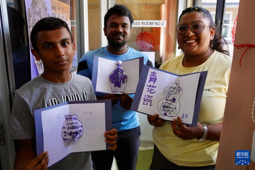 在學(xué)習(xí)制作青花瓷賀卡的課堂上,21歲的阿基拉·恰米卡拉一邊描畫青花瓷瓶身的弧線,一邊將斯里蘭卡大象與中國(guó)傳統(tǒng)紋樣填入其中,沿著畫紙細(xì)細(xì)裁剪幾道,便制成一張立體賀卡?!拔液芟矚g中國(guó)文化,我想在作品中將中國(guó)文化與斯里蘭卡本土文化相融合?!彼f。