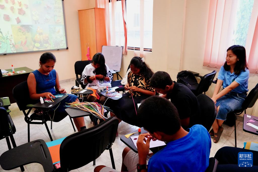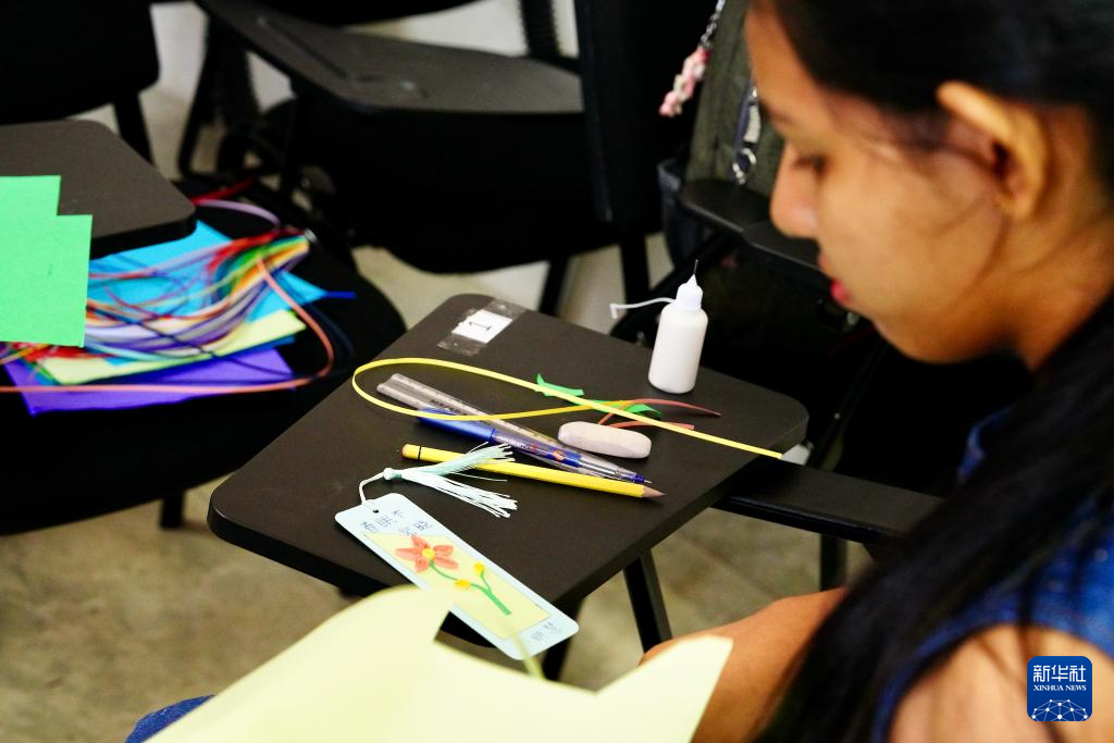 4月19日,在斯里蘭卡首都科倫坡舉行的聯(lián)合國(guó)中文日活動(dòng)上,蘭比尼孔子課堂的學(xué)生學(xué)習(xí)制作衍紙書簽。新華社記者 伍岳 攝