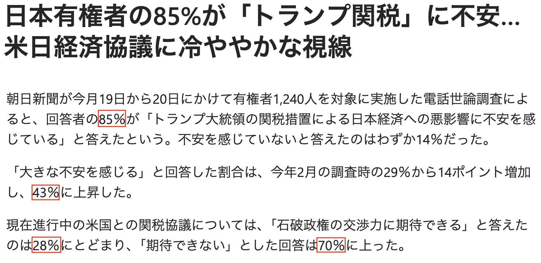 另據(jù)日本《朝日新聞》19日至20日進(jìn)行的民調(diào),多達(dá)85%的日本受訪者擔(dān)憂特朗普政府的關(guān)稅會(huì)對日本經(jīng)濟(jì)產(chǎn)生負(fù)面影響,其中43%的受訪者表示非常擔(dān)憂。