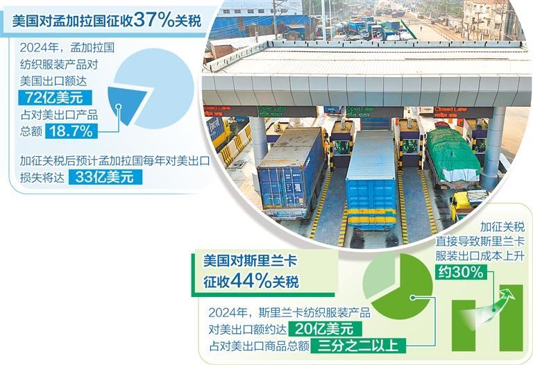 孟加拉國經(jīng)濟(jì)高度依賴紡織服裝產(chǎn)品出口,美國是孟加拉國除歐盟外的第二大出口市場。作為全球第二大服裝產(chǎn)品出口國,2024年,孟加拉國紡織服裝產(chǎn)品對(duì)美國出口額達(dá)到72億美元,占對(duì)美出口產(chǎn)品總額的18.7%。美國所謂“對(duì)等關(guān)稅”生效后,直接沖擊孟加拉國紡織服裝出口領(lǐng)域,使出口成本大幅增加,嚴(yán)重削弱了孟加拉國產(chǎn)品的價(jià)格競爭力。在此背景下,預(yù)計(jì)孟加拉國每年對(duì)美出口損失將達(dá)到33億美元。此外,近期印度政府宣布不再允許孟加拉國經(jīng)印度陸地海關(guān)對(duì)第三國出口貨物,此舉將在短期內(nèi)進(jìn)一步推高孟加拉國貨物出口成本。