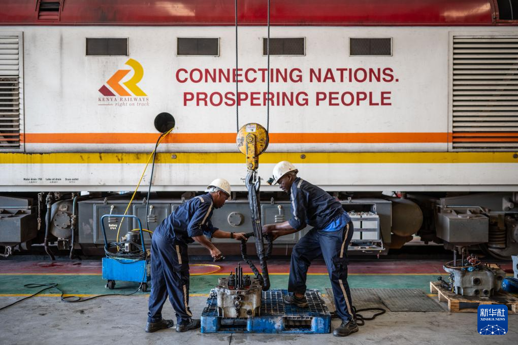 2025年1月23日,在肯尼亞內(nèi)羅畢蒙內(nèi)鐵路車間,維保人員在一輛印有“連接國(guó)家 走向繁榮”標(biāo)語(yǔ)的蒙內(nèi)鐵路機(jī)車前檢修配件。 新華社記者 王冠森 攝