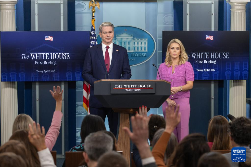 4月29日,美國白宮新聞秘書卡羅琳·萊維特(右)與美國財政部長斯科特·貝森特在華盛頓白宮出席記者會。新華社記者 胡友松 攝