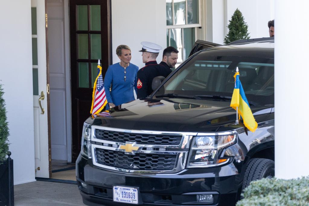 2月28日,烏克蘭總統(tǒng)澤連斯基(左三)離開美國華盛頓白宮。新華社記者胡友松攝