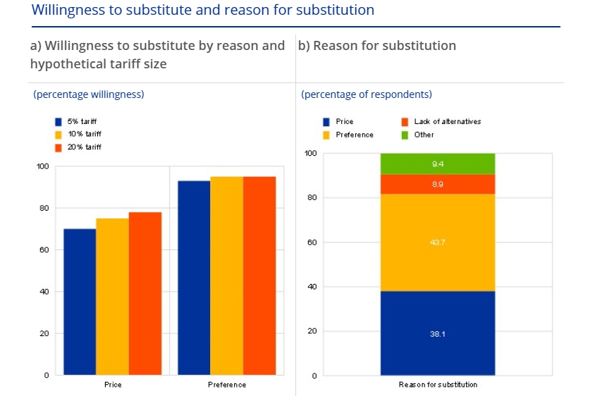歐洲央行在4月底的博文中還提到,通常情況下,關(guān)稅對(duì)消費(fèi)者的影響程度取決于受影響產(chǎn)品和服務(wù)的需求價(jià)格彈性,即如果價(jià)格上漲,消費(fèi)者可能會(huì)轉(zhuǎn)向更便宜的替代品。然而,近期美國的關(guān)稅可能會(huì)導(dǎo)致更廣泛的偏好轉(zhuǎn)變,使歐洲人完全放棄美國產(chǎn)品和品牌,不論價(jià)格如何變化。