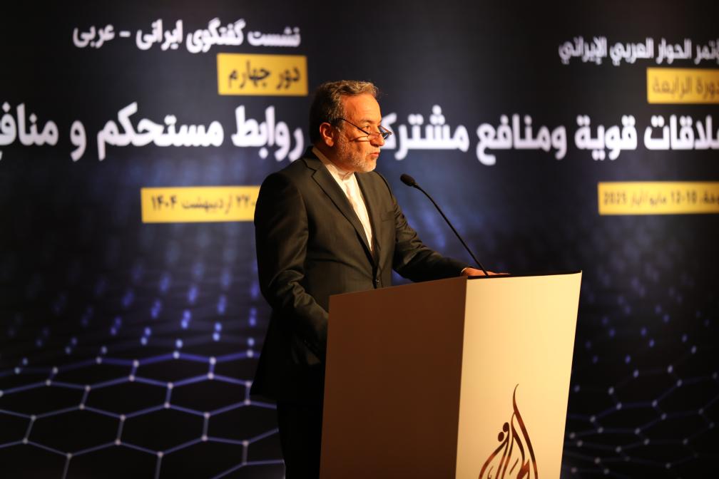 5月10日,伊朗外長阿拉格齊在卡塔爾多哈出席第四屆阿拉伯-伊朗對話會議時講話。新華社發(fā)(主辦方供圖)