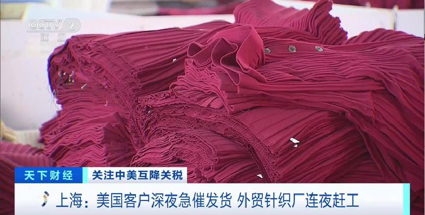 在中美大幅互降關(guān)稅后,位于上海松江區(qū)李塔匯鎮(zhèn)的一家針織廠,接到了美國客戶可以出貨的通知。已經(jīng)在包裝車間里堆了1個月的50000多件成衣,終于可以開啟最后的工序,車間內(nèi)的工人全員上崗,縫商標、熨燙、打吊牌,各個工序有條不紊。