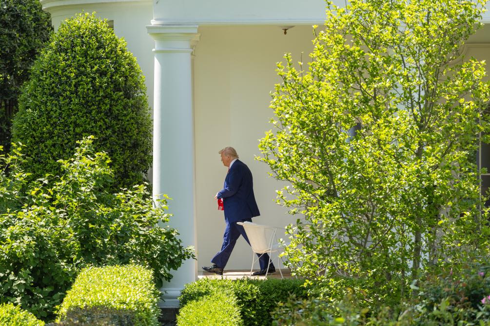 4月29日,在華盛頓白宮,美國(guó)總統(tǒng)特朗普走向南草坪準(zhǔn)備登機(jī)。新華社記者胡友松攝