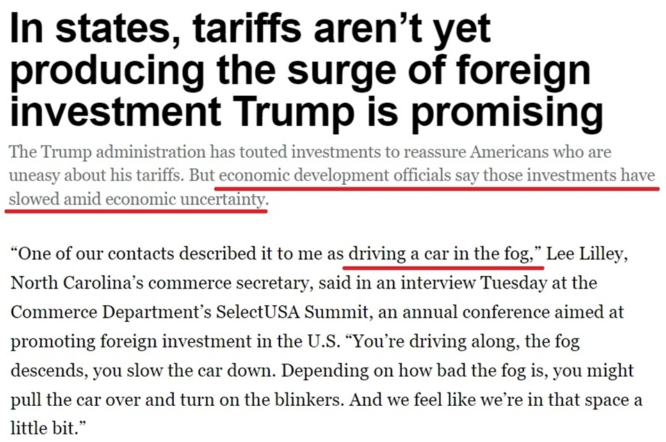 美國政府一直宣稱,加征關(guān)稅將為美國吸引數(shù)萬億美元的外國投資。但據(jù)美國《政治報(bào)》報(bào)道,來自美國多個(gè)州的政府官員和議員都抱怨說,白宮關(guān)稅政策引發(fā)的不確定性正在阻礙外資進(jìn)入美國市場(chǎng)。