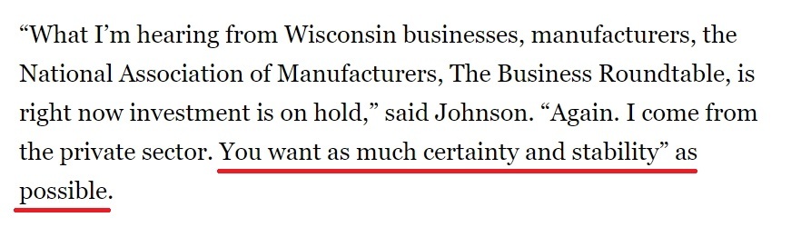 “我從本州的企業(yè)、制造商以及全美制造商協(xié)會(huì)和商業(yè)圓桌會(huì)議那里聽到的消息是,許多外商原定的投資計(jì)劃已經(jīng)被擱置。我本人來自私營(yíng)企業(yè),我知道企業(yè)最需要的就是盡可能多的確定性和穩(wěn)定性?!?/p>