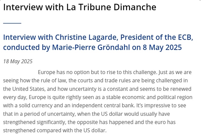 歐洲央行行長(zhǎng)拉加德日前接受采訪時(shí)也表示,近期歐元對(duì)美元走強(qiáng)看似有悖直覺,其實(shí)源于金融市場(chǎng)對(duì)美國失去了信心。這是美國反復(fù)無常的關(guān)稅等政策造成的,“對(duì)歐洲來說是一個(gè)機(jī)遇”。