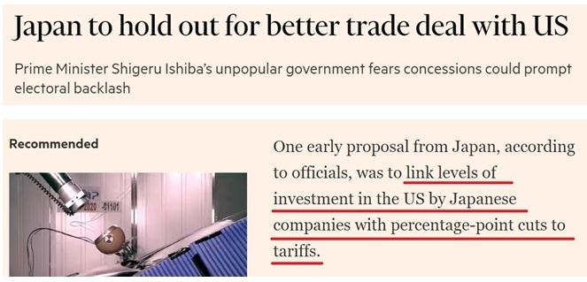 另據(jù)報(bào)道,考慮到日本是美國最大海外投資來源國,日方除考慮進(jìn)一步對(duì)美開放市場(chǎng)等讓步條件外,早期談判方案中還包括將美國對(duì)日商品關(guān)稅減免的百分點(diǎn)與日本企業(yè)在美投資水平掛鉤。