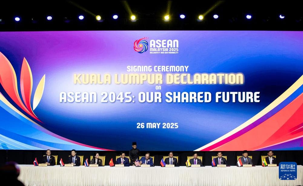 5月26日,在馬來西亞首都吉隆坡,老撾總理宋賽、新加坡總理黃循財(cái)、泰國(guó)總理佩通坦、越南總理范明政、馬來西亞總理安瓦爾、菲律賓總統(tǒng)馬科斯、文萊蘇丹哈桑納爾、柬埔寨首相洪瑪奈、印度尼西亞總統(tǒng)普拉博沃、緬甸外交部常秘昂覺莫(前排從左至右)出席第46屆東盟峰會(huì)“吉隆坡宣言”簽署儀式。新華社記者 馬平 攝