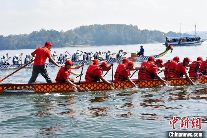 當?shù)貢r間5月31日,巴西瑞安商會和巴西青田同鄉(xiāng)總會在巴西圣保羅聯(lián)合舉辦“慶端午,龍舟競渡”活動,吸引近500名僑胞和巴西友人參加。圖為巴西瑞安龍舟俱樂部和巴西青田龍舟隊擊鼓競渡。中新社記者 林春茵 攝