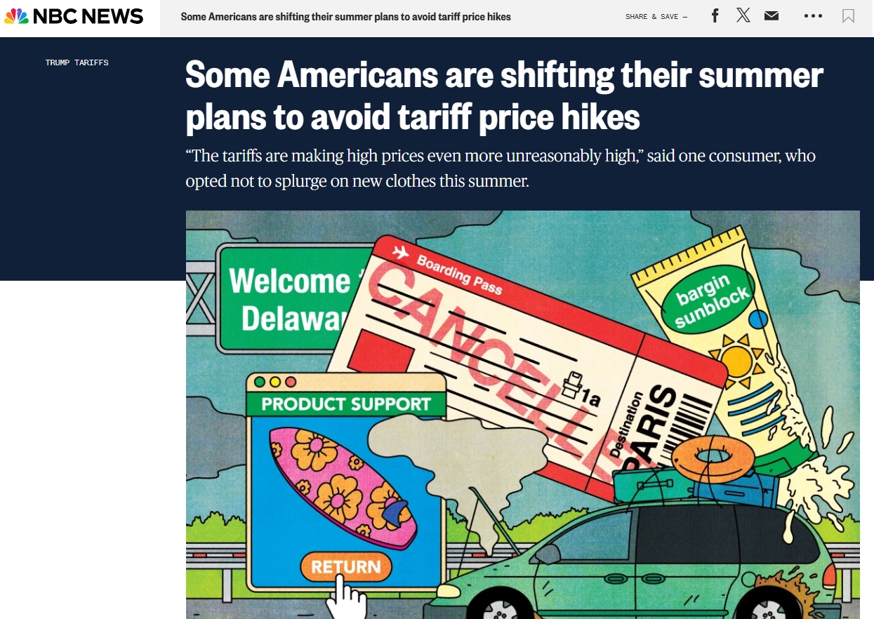對于美國普通消費者而言,關稅也讓他們今年的夏天和往年有所不同。美國全國廣播公司網(wǎng)站近日的一篇文章說,美國政府的關稅政策,讓美國消費者對自身成本的擔憂持續(xù)加劇,他們不得不減少休閑活動和購物狂歡。