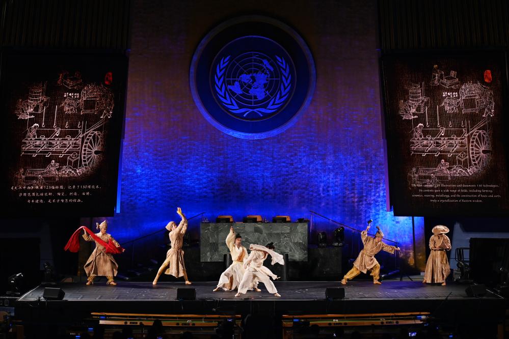 6月9日,在位于紐約的聯(lián)合國總部,演員在“跨越山海的文明對話”專場文藝演出上表演舞劇《天工開物》選段。新華社記者 李睿 攝