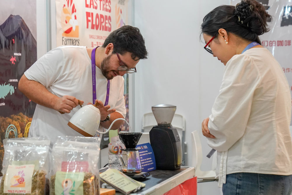6月20日,來(lái)自薩爾瓦多的參展商(左)在咖啡產(chǎn)業(yè)館為顧客沖咖啡。 新華社發(fā)(彭奕凱 攝)