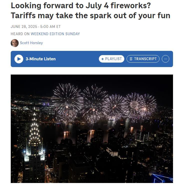 美國(guó)全國(guó)公共廣播電臺(tái)網(wǎng)站近日發(fā)表一篇文章說(shuō),美國(guó)人即將迎來(lái)獨(dú)立日慶典,燒烤派對(duì)、節(jié)日游行和煙花表演自然是重頭戲。但受特朗普政府加征關(guān)稅影響,今年煙花價(jià)格可能飆升,供應(yīng)也將更加緊俏。這是因?yàn)?,美?guó)用于慶祝獨(dú)立日的火箭煙花、手持電光花和噴泉禮花,幾乎完全依賴(lài)中國(guó)供應(yīng)——而早在一千多年前,正是中國(guó)人發(fā)明了煙花。