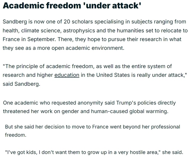 還有一位女學(xué)者告訴媒體,美國現(xiàn)政府的政策直接威脅到她有關(guān)氣候變暖等方面的研究工作,她搬到法國不僅是為了學(xué)術(shù)自由,還是因為不想讓自己的孩子“在一個充滿敵意的地方長大”。
