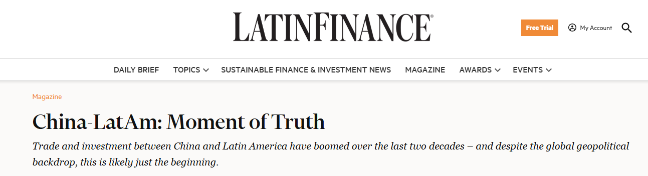 長期關(guān)注拉美及加勒比地區(qū)發(fā)展的《拉美金融》雜志最近的一篇文章,聚焦了過去二十年拉丁美洲與中國之間貿(mào)易和投資的蓬勃發(fā)展。文章指出,盡管當(dāng)前全球地緣政治形勢(shì)復(fù)雜,但拉美與中國這種良好的發(fā)展勢(shì)頭可能僅僅是雙方合作的開端。