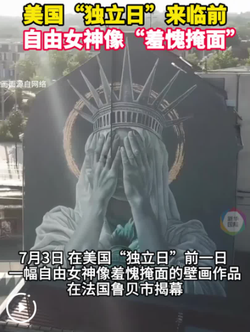 7月3日,在美國“獨立日”到來前一日,一幅自由女神像羞愧掩面的壁畫作品在法國魯貝市揭幕。