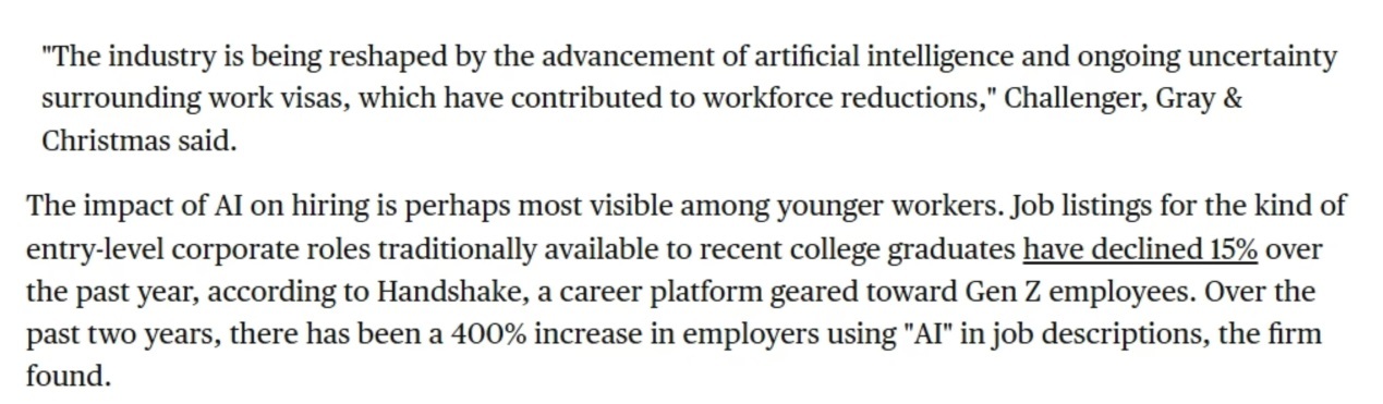 報(bào)告分析,人工智能的快速進(jìn)步與工作簽證政策的不確定性,正在重塑就業(yè)格局。其中,年輕求職者首當(dāng)其沖。過(guò)去一年,美國(guó)企業(yè)面向應(yīng)屆畢業(yè)生的初級(jí)職位招聘量下降15%,而招聘要求中提及“人工智能”的崗位數(shù)量卻激增400%,凸顯技能需求結(jié)構(gòu)性轉(zhuǎn)變。