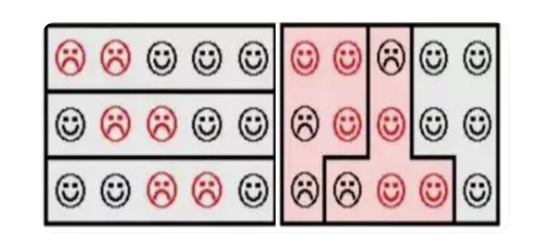 上圖是個簡化的例子,通過不同的區(qū)域劃分,黑方在左圖的每個區(qū)域中都占據(jù)多數(shù),對紅方取得了3:0的優(yōu)勢。但按右圖的方式劃分,紅方反而取得了2:1的領(lǐng)先。
