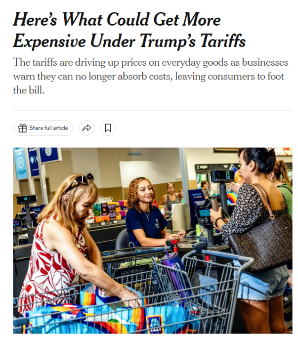 美國政府此前公布的經(jīng)過調(diào)整的“對等關(guān)稅”已經(jīng)生效,美數(shù)十個(gè)貿(mào)易伙伴將被征收10%至41%不等的關(guān)稅,隨之而來的便是被關(guān)稅推高的物價(jià)。美國《紐約時(shí)報(bào)》刊文稱,美國消費(fèi)者或許很快就會(huì)發(fā)現(xiàn),大到汽車,小到一雙鞋和一根香蕉,幾乎所有商品的售價(jià)都會(huì)上漲。
