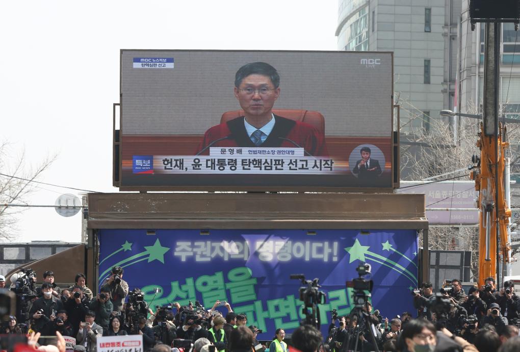 4月4日,民眾在韓國(guó)首都首爾的韓國(guó)憲法法院附近觀看尹錫悅彈劾案宣判過程的電視直播。新華社記者姚琪琳攝