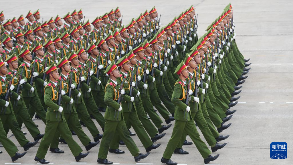 9月2日,在越南河內(nèi)巴亭廣場(chǎng),越南軍隊(duì)方陣走向主席臺(tái)接受檢閱。新華社記者 胡佳麗 攝