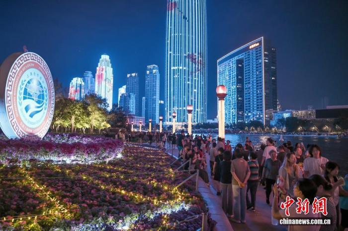 8月28日晚,市民和游客漫步天津海河畔,參觀“2025上海合作組織峰會”主題花壇。中新社記者 佟郁 攝