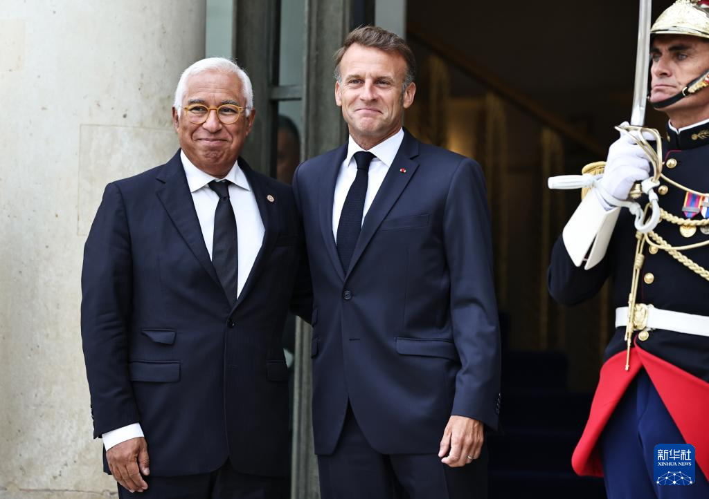 9月4日,在法國首都巴黎的總統(tǒng)府愛麗舍宮,法國總統(tǒng)馬克龍迎接出席“志愿聯(lián)盟”線上會議的歐洲理事會主席科斯塔(左)。新華社記者 高靜 攝