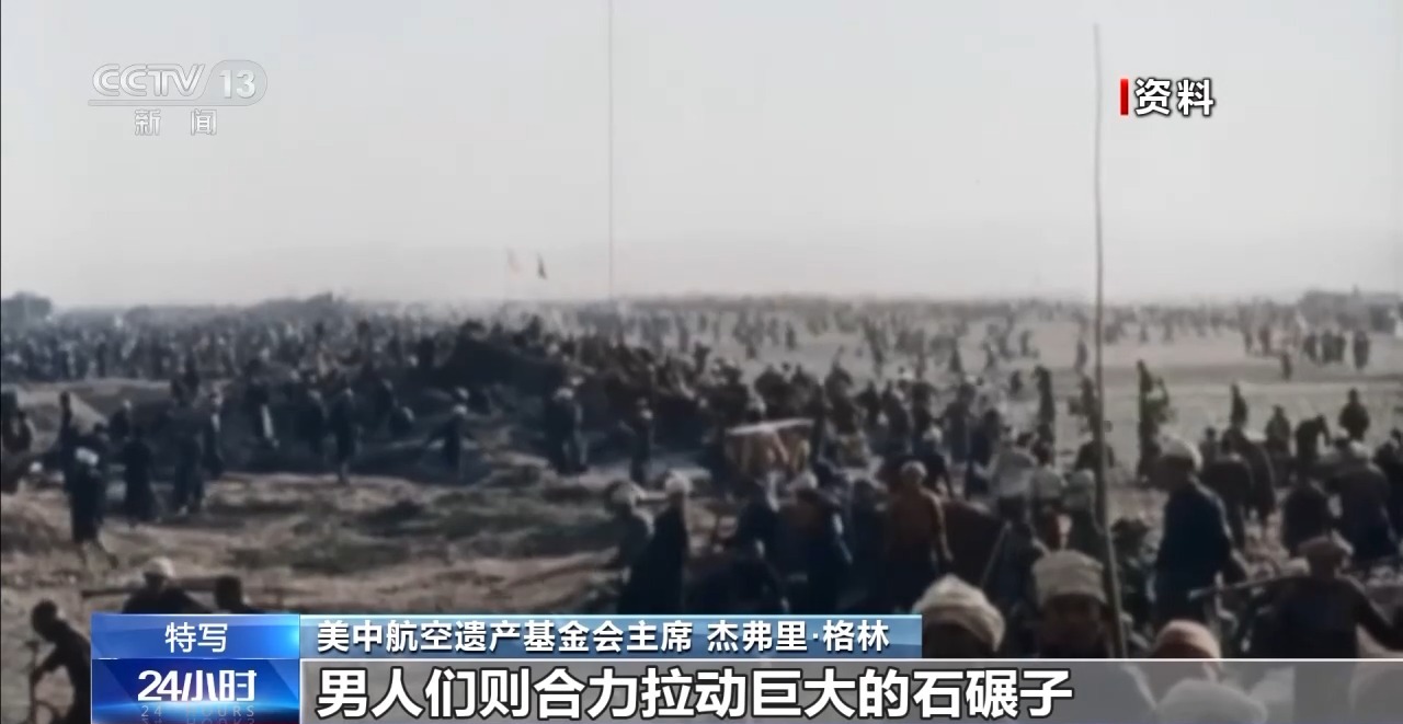 美中航空遺產(chǎn)基金會主席 杰弗里·格林:婦女們背上背著孩子,坐在地上把大石塊敲成小石子;孩子們再把小石子撿到指定地點;男人們則合力拉動巨大的石碾子,有時候要100個人才能拉動一臺10噸重的石碾子,就為了把跑道壓平整。無論是寒冬還是酷暑,婦女們敲碎的每一塊石頭,都是在為機場出力,為飛機起降創(chuàng)造條件,讓美國飛行員能順利升空抗擊日軍。這背后是一種信念:他們所做的一切都在為勝利搭建基礎。