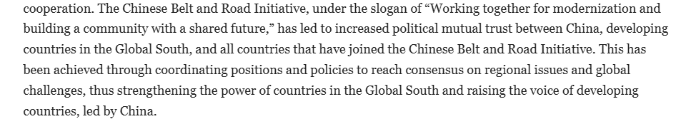 文章注意到,中國(guó)不僅提出與全球南方國(guó)家構(gòu)建人類命運(yùn)共同體的新理念和新倡議,還宣布了與全球南方國(guó)家開展務(wù)實(shí)合作的新措施,涉及國(guó)家治理、工業(yè)化與農(nóng)業(yè)現(xiàn)代化、和平與安全,以及共建“一帶一路”框架下的高質(zhì)量合作等新議題,以實(shí)現(xiàn)互利共贏。