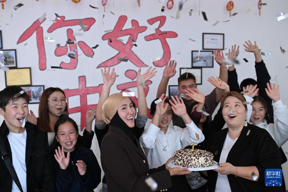 9月22日,在吉爾吉斯斯坦伊塞克湖州卡拉庫爾市,庫巴內(nèi)奇別科娃(前右)和同事、學生們共同慶祝中文培訓中心成立一周年。新華社記者 李任滋 攝