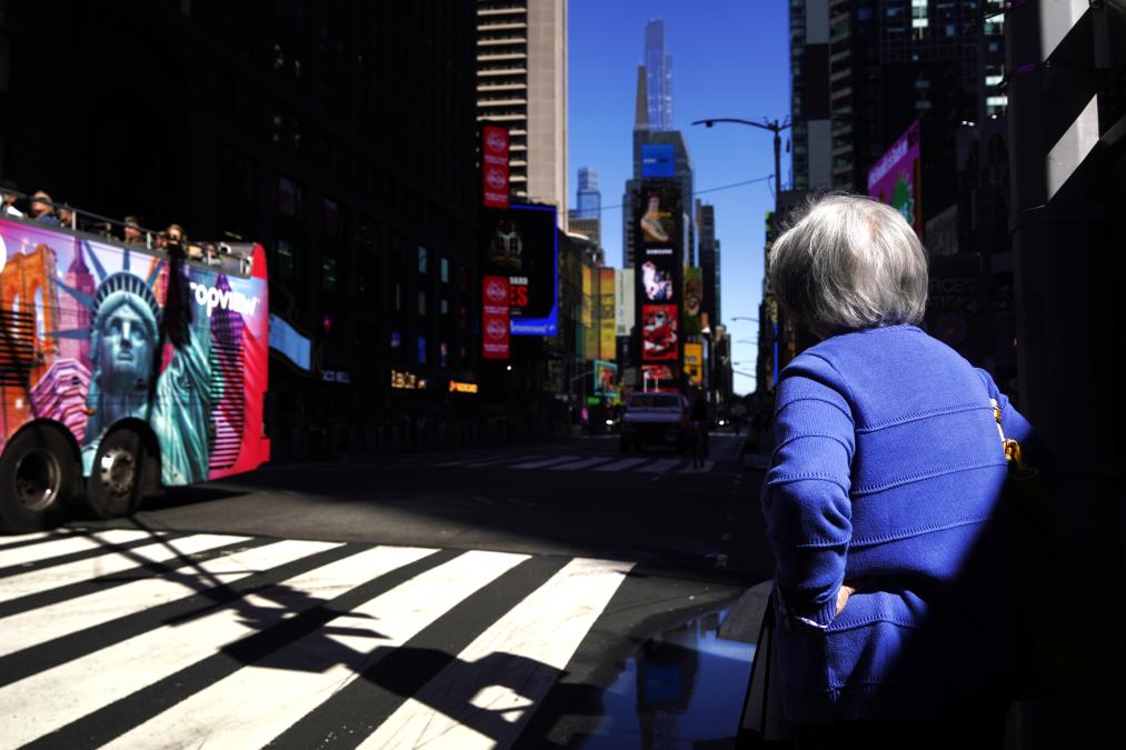 10月1日,在美國紐約曼哈頓的時報廣場附近,行人等待通過人行橫道斑馬線過馬路。新華社記者 吳曉凌 攝