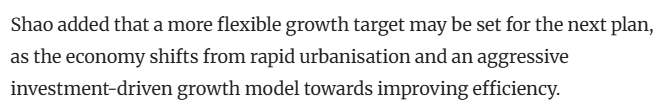 《南華早報》援引分析人士的表述認(rèn)為,隨著中國經(jīng)濟(jì)從快速城鎮(zhèn)化和投資驅(qū)動型增長模式轉(zhuǎn)向高質(zhì)量發(fā)展,中國下一個五年規(guī)劃可能會設(shè)定更靈活的增長目標(biāo)。