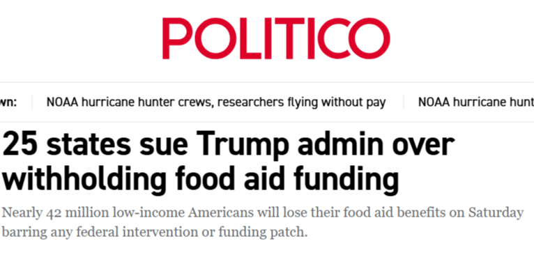 據(jù)美國(guó)《政治報(bào)》網(wǎng)站報(bào)道,受政府持續(xù)“停擺”影響,美農(nóng)業(yè)部宣布暫停其“補(bǔ)充營(yíng)養(yǎng)援助計(jì)劃”(SNAP),11月1日起停止發(fā)放食品救濟(jì)。目前這一項(xiàng)目覆蓋約4200萬(wàn)人,約占美國(guó)總?cè)丝诎朔种?,其中多?shù)為低收入群體和殘障人士。SNAP項(xiàng)目暫停后,他們的生活將難以為繼。當(dāng)?shù)貢r(shí)間28日,民主黨主政的25個(gè)州和首都華盛頓對(duì)聯(lián)邦政府提起訴訟,要求動(dòng)用聯(lián)邦應(yīng)急資金,以維持這一項(xiàng)目。