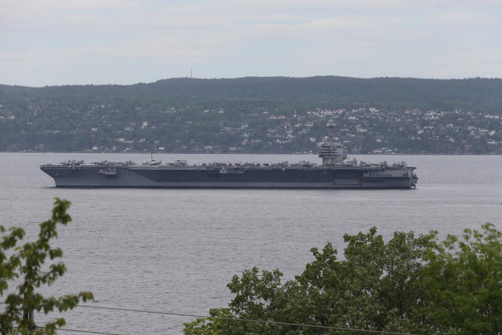 2023年5月24日,美國“杰拉爾德·R·福特”級航空母艦首艦“福特”號停靠在挪威首都奧斯陸的峽灣中。新華社記者張玉亮攝