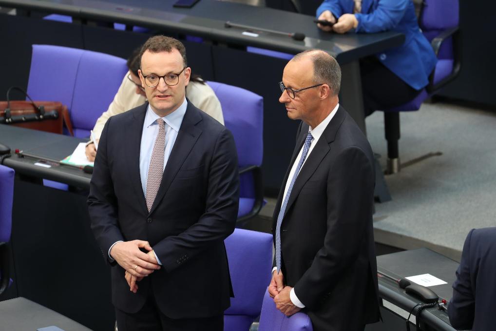 5月6日,在德國首都柏林的國會(huì)大廈,默茨(右)在第二輪投票議程中。新華社記者杜哲宇攝