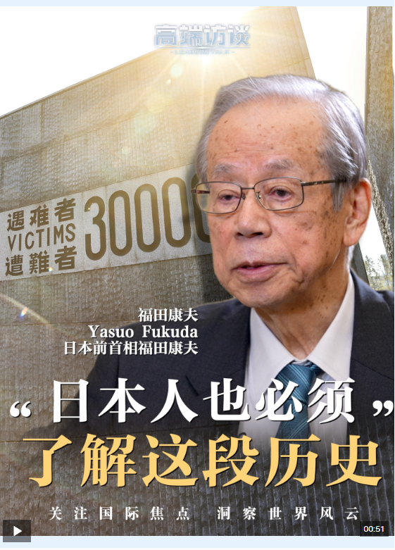 日本前首相福田康夫曾在2018年參觀侵華日軍南京大屠殺遇難同胞紀(jì)念館,他是第四位參觀的日本前首相。接受總臺《高端訪談》專訪時,他說,日本人也必須了解這段歷史。